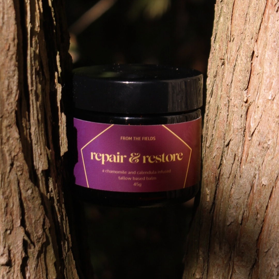 At From The Fields we prioritise long slow infusions to preserve the benefits of all ingredients. Our tallow is grass fed and finished, rendered slowly at a low temperature. The tallow for Repair and Restore is then mixed with Calendula and Chamomile which are cold infused by the power of the sun over a period of at least 6 weeks with cold-pressed Avocado Oil.